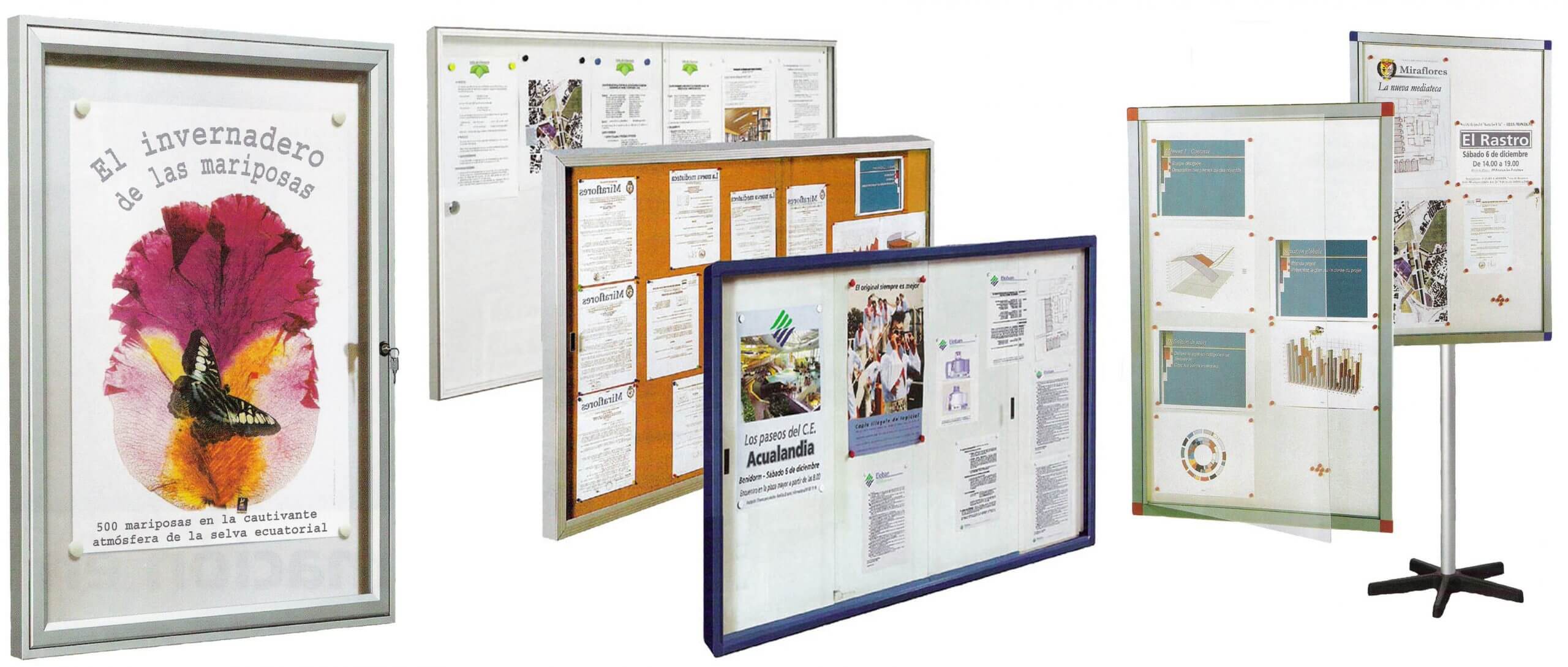 Disponemos de un amplio catálogo de vitrinas con diversidad de tamaños y formas de apertura. Vitrinas de interior para portales y zonas protegidas y vitrinas de exterior con juntas de estanqueidad. Tablones de anuncios con marcos de aluminio y fondos de chapa. Apertura de puerta batiente, puerta corredera o puerta levadiza. Diferentes tipos de colocación de vitrinas: Murales, sobre postes.